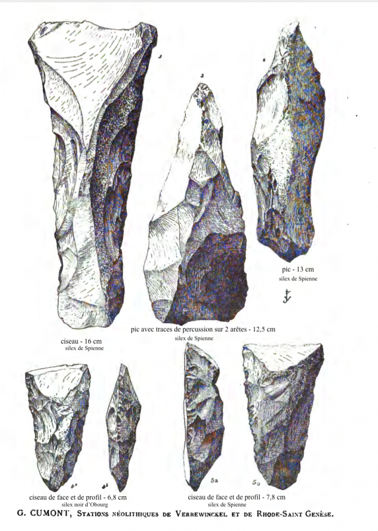 C'est par deux autres habitants de Linkebeek, collectionneurs de silex de l'âge néolithique, que nous avons eu l'attention attirée par un autre sujet qui sera celui de notre prochaine exposition. Les confins d'Uccle et de Linkebeek, alors très boisés, et les communes voisines Rhode ou Beersel, qui l'étaient autant, étaient constellées de sites d'habitat vers 4.000 avant notre ère. Leurs traces ont pu être relevées à la fin du 19e siècle, avant l'urbanisation moderne. Quantité de silex taillés y ont été ramassés. Les historiens anthropologues, géologues en ce temps, formaient des sociétés savantes qui se passionnaient pour notre passé préhistorique et tentaient de comprendre l'aube de la civilisation. Aujourd'hui c'est avec prudence et une obstination scientifique que l'on essaye de saisir plus rigoureusement les caractéristiques de ces sociétés, en échappant si possible au piège de l'évolutionnisme qui ferait de ces être primitifs, que l'on a bien voulu appeler Sapiens, les précurseurs et annonciateurs d'une civilisation dont nous représentons le brillant accomplissement. Madame au foyer, Monsieur à la chasse, il semblerait que les préhistoriens jusqu'au milieu du 20e siècle aient projeté leur condition sociale sur le passé lointain et écrit beaucoup de choses sans aucun fondement. Il reste que la connaissance de ces sites d'habitat, si nombreux et voisins les uns des autres, laissent à l'imagination mille questions en suspens et des pistes nombreuses. On ne sait à peu près rien de la structure sociale de ces sociétés. Mais en suivant leurs déplacements, par les silex qu'ils acquéraient, nous parcourons mentalement les collines et les sentiers dans les bois qui allaient de l'un à l'autre de ces sites, et qui de Boitsfort à Spiennes en passant par Uccle, Linkebeek et Rhode, formaient un réseau de relations, dont la présence de silex taillés dans chacun de ces sites offrent la preuve.